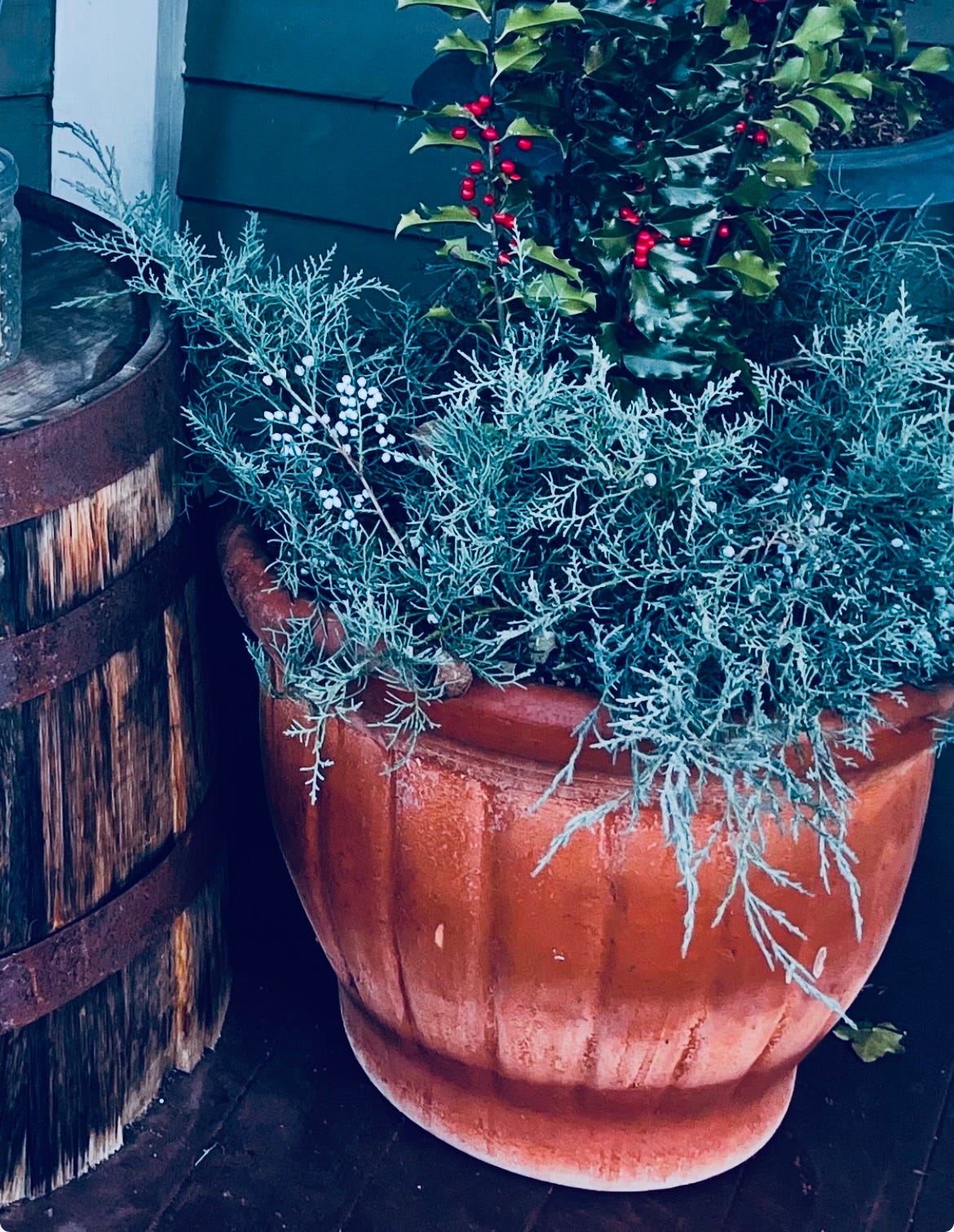 Fresh Christmas greens can cost an arm and a leg. The price is usually worth it: not only are you taking the opportunity to support local growers, but you are also filling your house with the piny smells of the season, which pull off the unique trick of being both bracing and comforting at the same time. But, if you have ambitions for big porch or table displays, you might not need to look further than your own backyard for supplies. I am a great believer in cut juniper as a decoration: it keeps its look and scent for weeks, comes in all sorts of intriguing shades of green-blue, bears cheerful berries that smell like gin, and is typically available for free in abundance. Supplement it with a little holly, some red-twig dogwood, or winterberries snagged on a snowy hike, and you can make kingly potted displays at little to no cost.