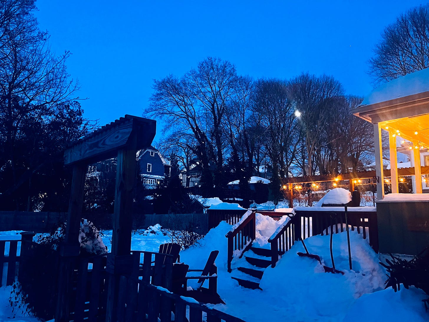 One evening last week, I crammed on a wool hat after the kids were tucked in and went out, swinging my salt bucket, to clear the section of the driveway that leads into our backyard around the house. This was not a moment where the winter-lover in me felt braced and refreshed by an encounter with raw nature and the stark outlines of bare trees. I am not, as far as I know, capable of poetic reflections once the wind chill drops below zero. Shivering and cursing, I shoveled, scraped, heaved, and trudged, fighting my way from the front of our icicle-toothed house to the back, through a landscape that had become borderline-unrecognizable, a lunar tableau of heaped snow, shivering gray, and blue moonlight.