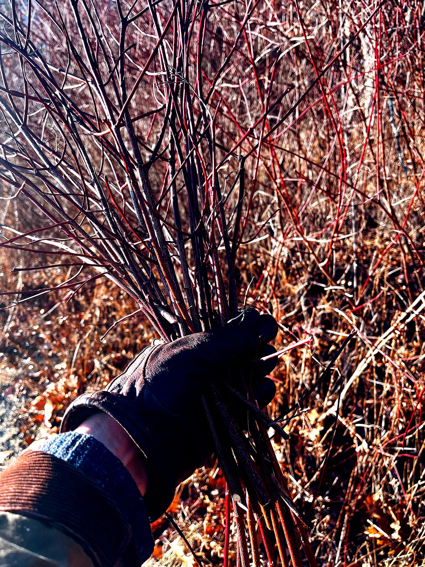 There were no winterberries in the woods. I stamped and rubbed my ears, with the huge noise of the wind growling in the trees overhead. Switching to plan B, I plodded back along the running track, scanning the undergrowth for rose hips. I was wrestling a modest branch of these out of its nest, and cursing my luck for the sparseness of it, when some part of my mind shifted, and my own inner voice seemed to say, “Look closer.” I stepped back, and realized that the little spray of roses I’d been struggling with was growing in a thicket of red-twig dogwoods. Everywhere around me, stabbing and flaming in every direction, was the unmistakable carmine of those branches. In ten minutes, I was walking back—my ears numb and red as the stick—with armloads of them; far more than we would need to decorate every entrance in the school.