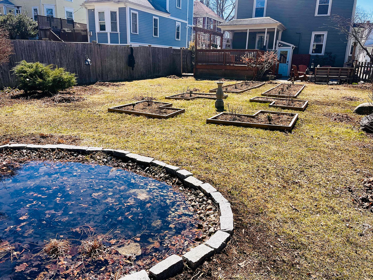 I warmed to it emotionally as well as physically. There’s something healthy and symbolic and cathartic about removing all of last year’s dead material, raking the brown grass out of the fledgling green, and mowing over all the dessicated piles, dumping the resultant chop into the compost heap. Drained by the ongoing drought, our pond also needed topping up, so I did most of that work to the soothing gurgle of water running over stones. The robins, wrens, and cardinals were loud in the maple overheard and, gradually, everything began to take on an orderly and intentional, if not exactly living or beautiful, appearance.